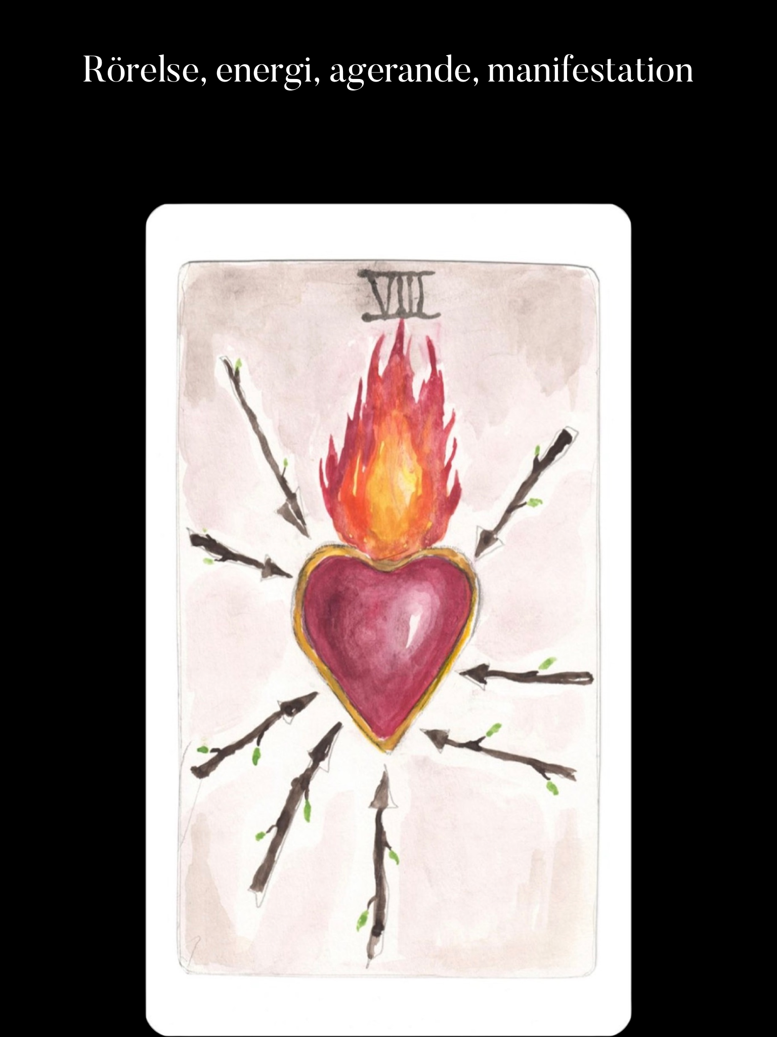 Det kommer snart att hända grejer. Åtta i stavar är ett snabbt kort som visar att du agerar, sätter igång och manifesterar. Det indikerar en dynamisk tid då mycket händer. Då mycket faller på plats. Om du undrar över om det är dags att agera så är svaret ja! Ta tag i saker och se till att du skapar rörelse, det kommer att ge positiva ringar på vattnet. Förändring är på väg så fort du tar steget. Du har energi, livskraft och du vet vad du vill. Kortet kan också visa passion och känslor som hettar till.