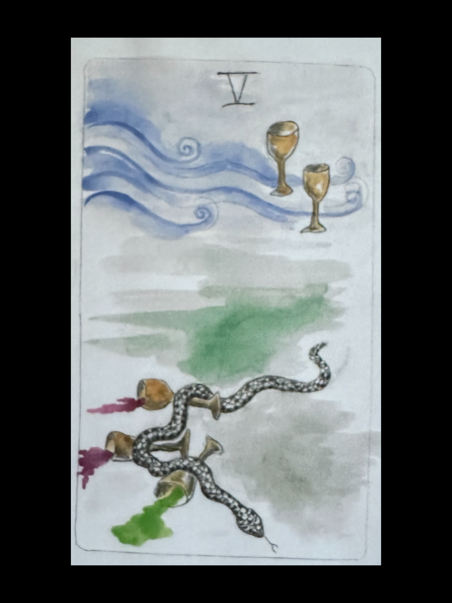 Utspillda bägare symboliserar det som gått förlorat. Det hopp. de drömmar och den kärlek som lämnat oss, eller som vi inte tog tillvara på och därmed miste. Det finns ett element av skuld och skam i det här kortet. Dåligt samvete eller ångest. Fem i bägare är ett tungt kort som visar den sorg och sårade känslor efter en förlust. Oro, vrede, saknad och övergivenhet.