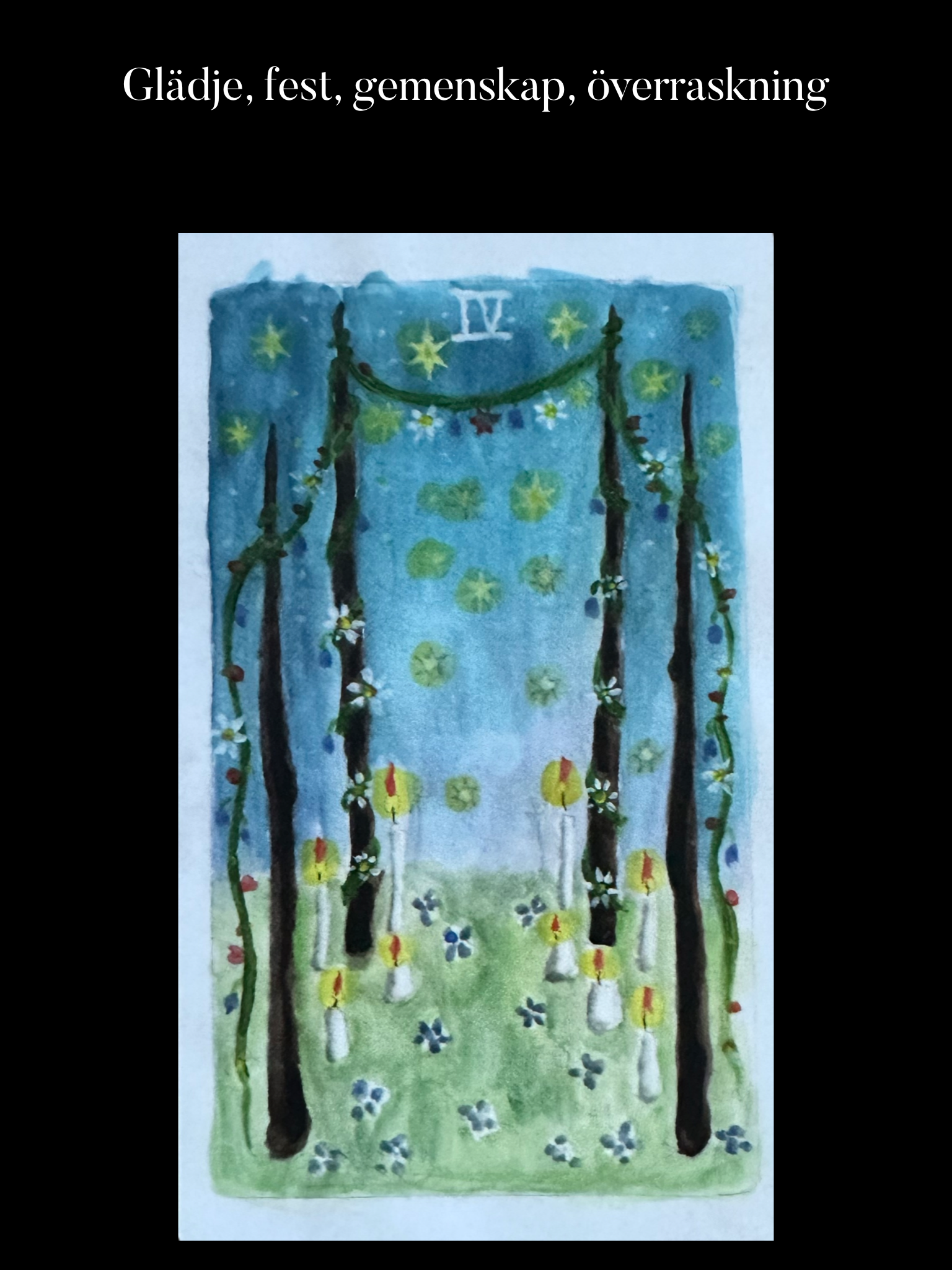 Fyra i stavar är ett kort fyllt av glädje. Ett kort som jag alltid blir glad av att se eftersom det oftast har med sig någon typ av överraskning. Jag brukar råda mina klienter att vara öppna för livet när kortet kommer upp, att säga ja till inbjudningar och spontana sammankomster. Kortet kan nämligen indikera att något speciellt positivt kan ske i ett sådant sammanhang.