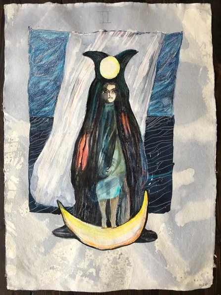 Översteprästinnan är ett kort som sticker ut ur Den stora arkanan, de flesta motiven bygger på arketyper vi känner till, kejsare, kejsarinna, djävul. Men en kvinnlig präst redan på 1400-talet då kortets motiv först blev till, var inte det otänkbart? Kortet ursprunliga namn är “Papesse” som betyder Påvinna. På 1400-talet styrde den kristna Påven med järnhand och en kvinnlig jämlike var inte en allmänt accepterad tanke. Men den fanns, i ockulta sällskap och i religiösa grupper. Den kristna kyrkan är kända för att ha raderat ut det heligt feminina och satt balansen ur spel. Fadern, sonen och den helige ande. Var är Modern och dottern? Livet kan inte bara bygga på maskulina värden.